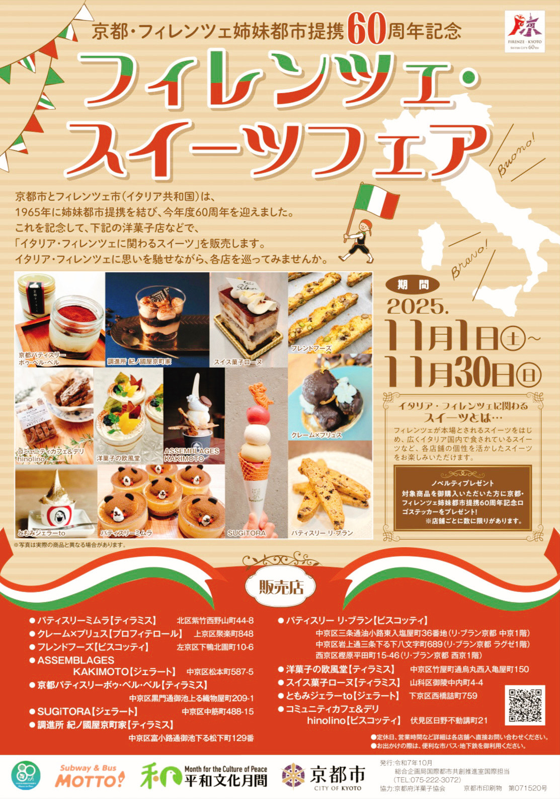 京都市とフィレンツェ市の姉妹都市提携60周年記念して 「イタリア・フィレンツェに関わるスイーツ」を京都市内の色々なお店で販売するイベントが開催されます。